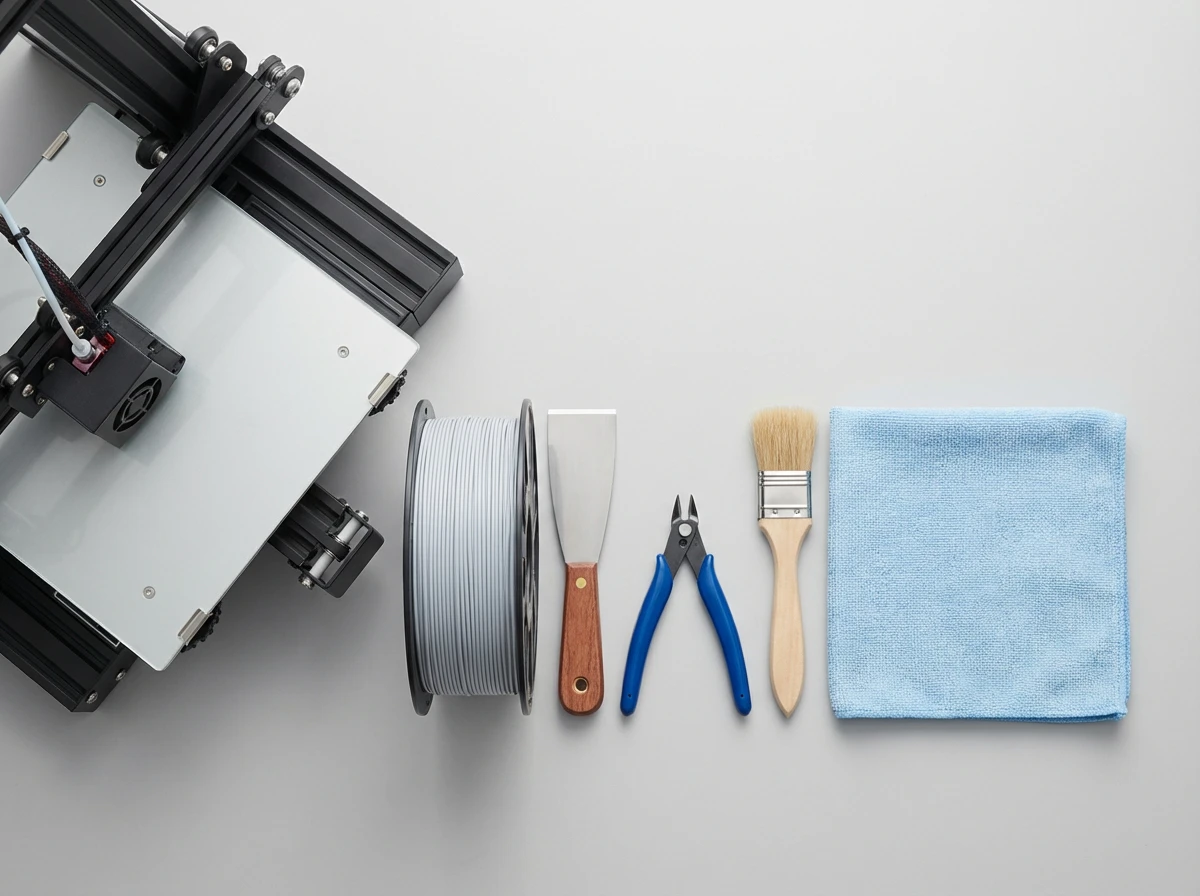 At a minimum, you need a 3D printer, a roll of filament (preferably PLA), and a computer or phone to select and print models. Handy extras include a spatula, small pliers, and a brush to keep your build plate clean.