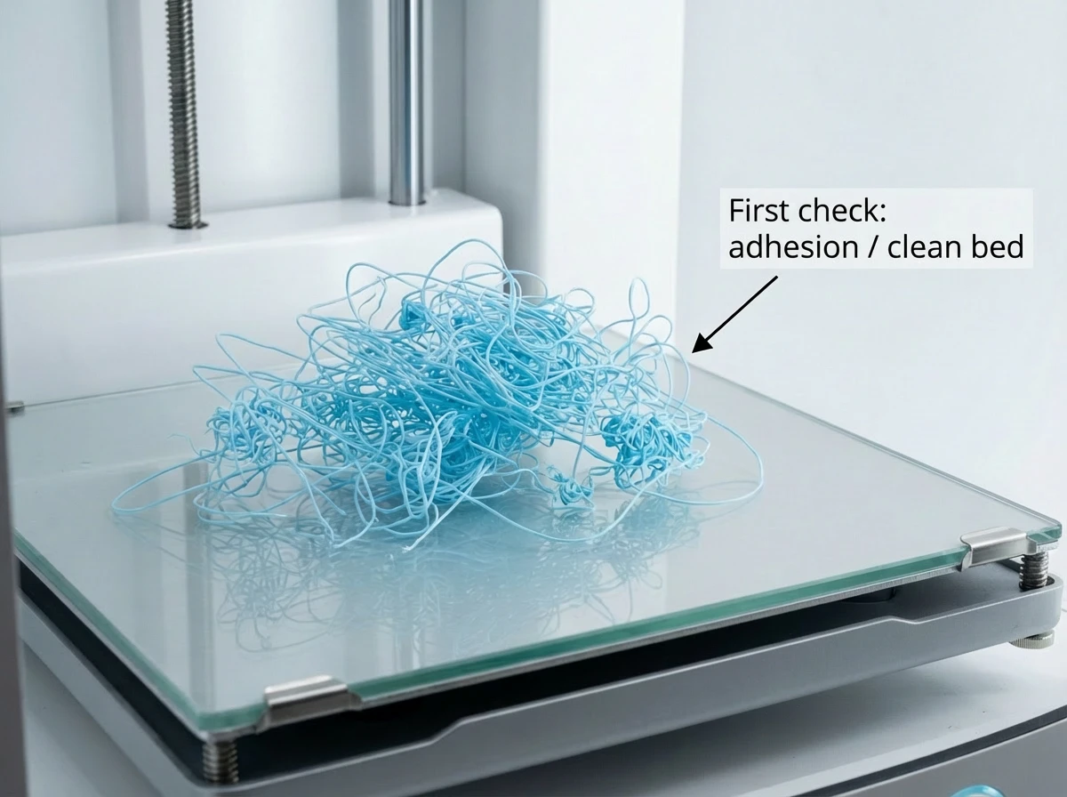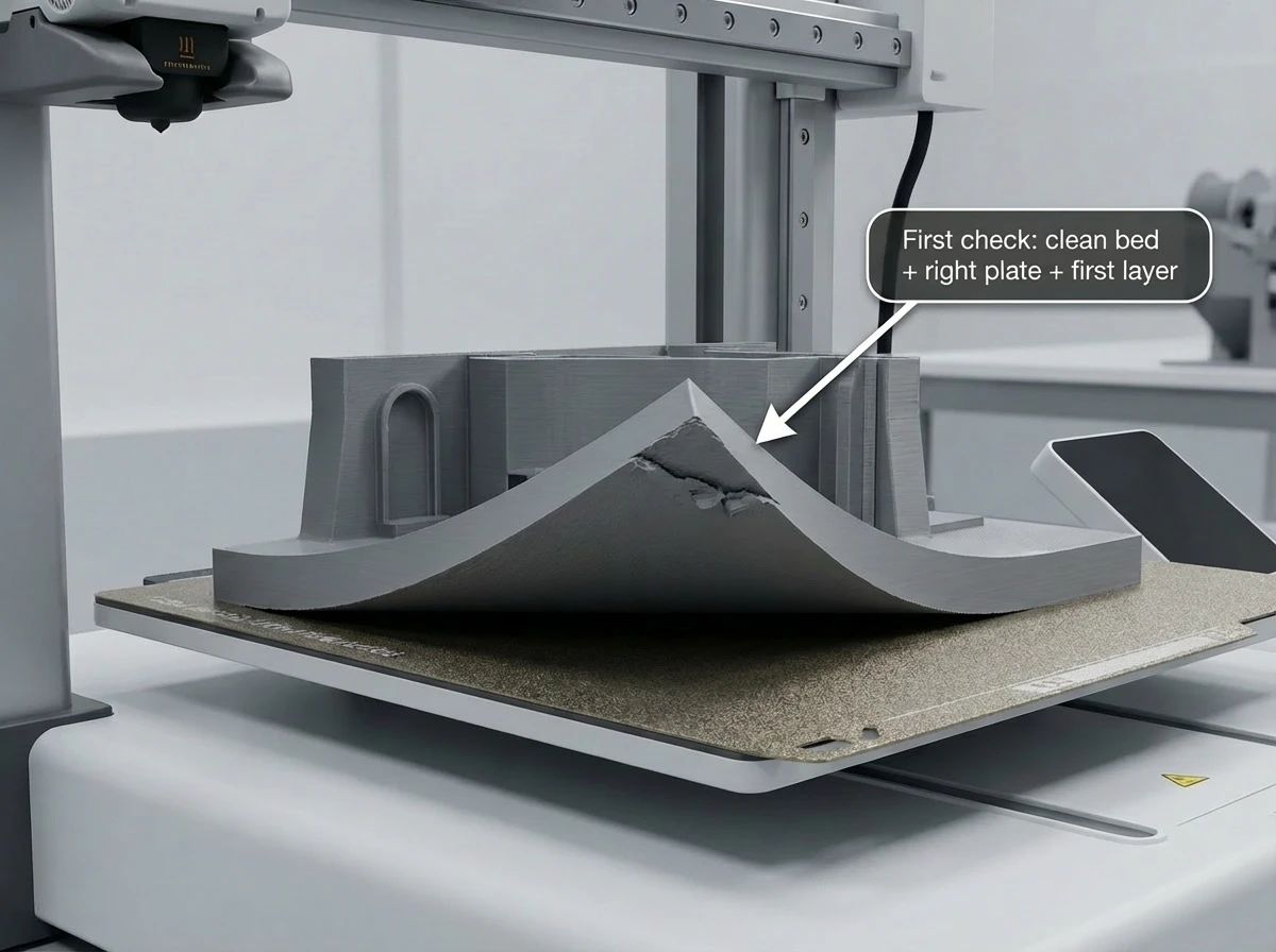 Symptom: corners curl up or the model slides away. Cause: the build plate is dirty, or the contact surface is too small. First check: clean the build plate and choose a model with more feet.