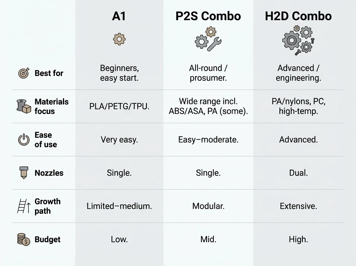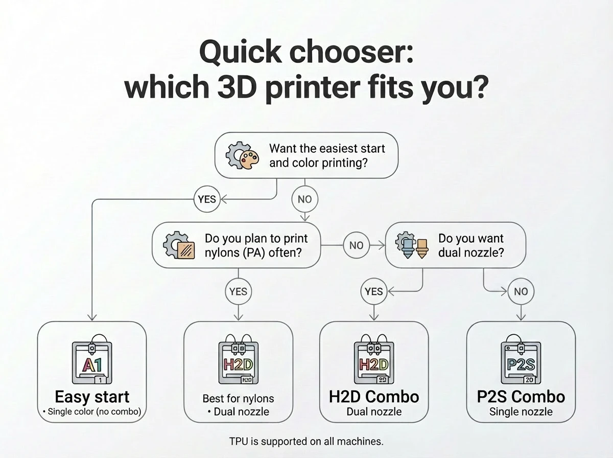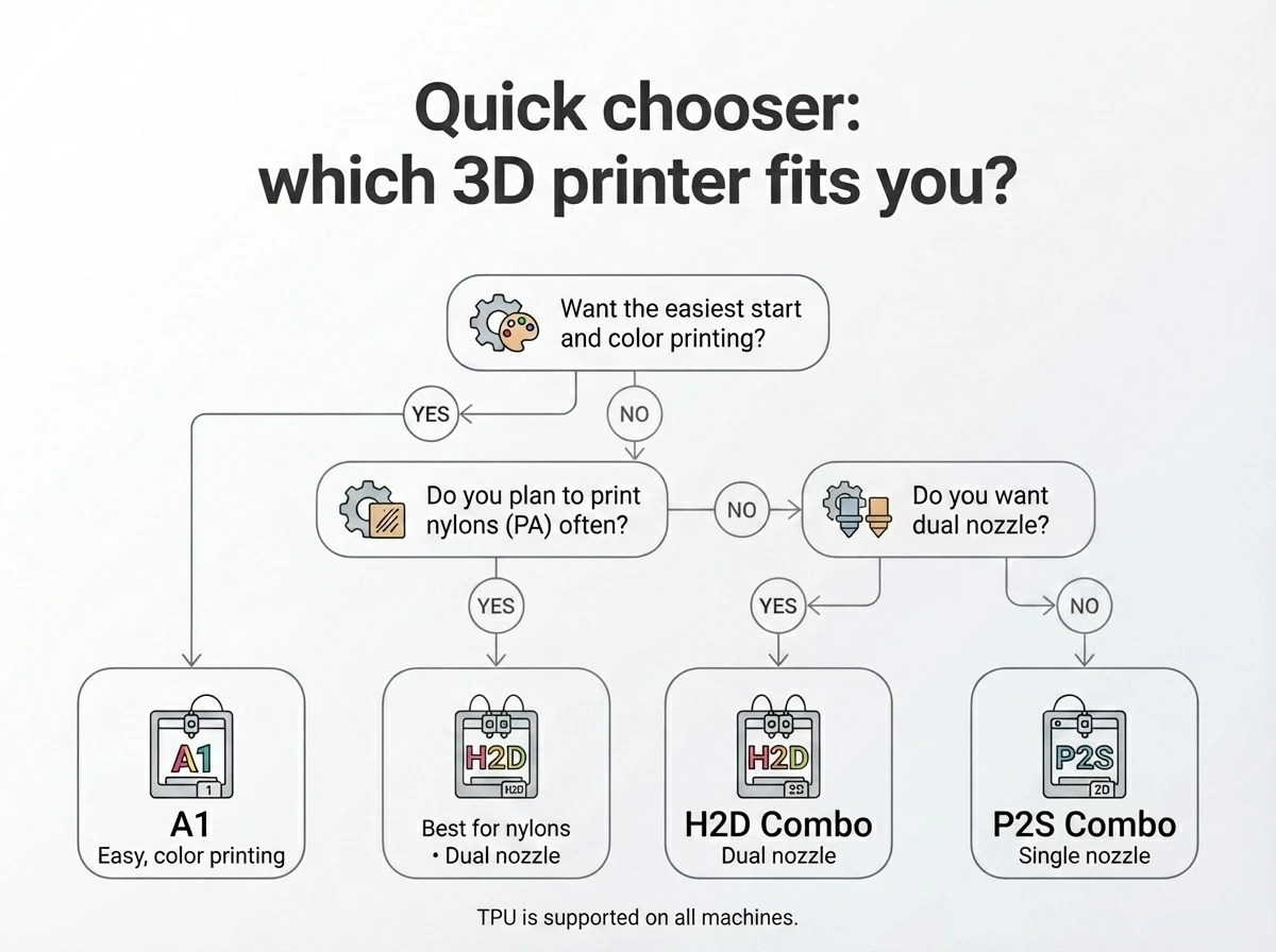 Choose a printer with good profiles and a predictable workflow. For a tight budget, the Bambu Lab A1 is often the most logical entry point. If you want an all-round printer with more consistency and more material options, the Bambu Lab P2S Combo is a strong choice. And if you already know you will be printing a lot and want to grow, the Bambu Lab H2D Combo is a better fit.