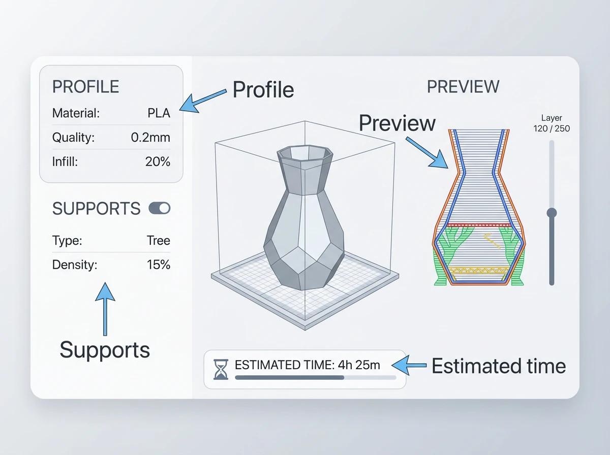 A slicer is software that converts your 3D model into print instructions for the printer. Without a slicer, the printer does not know how to move layer by layer and lay down material.