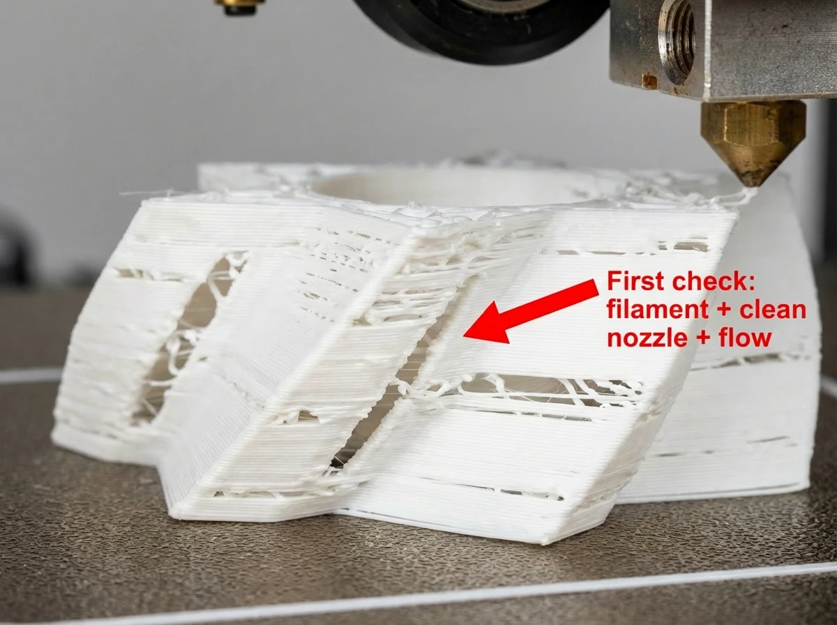 Symptom: thin layers, holes, or little material coming out. Cause: the nozzle is partially clogged or the filament is not feeding through properly. First check: verify that the filament can run freely and that there is no kink or resistance.