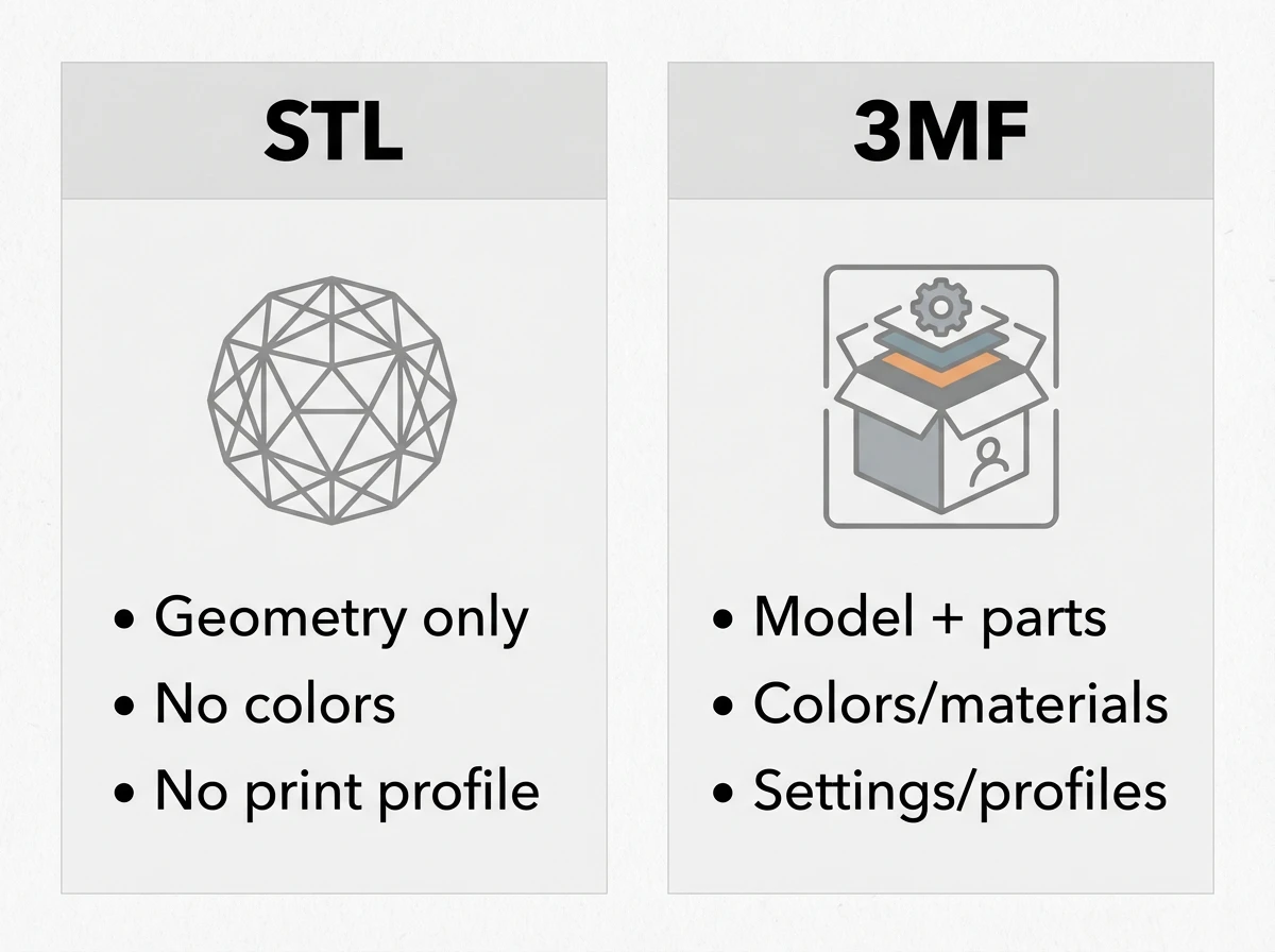 An STL is usually a bare 3D model: shape and dimensions, without extra project info. A 3MF is more often a complete project file. It can contain multiple parts, and sometimes also information such as colors or how the model is constructed. For beginners, STL is often the simplest, but 3MF can actually be useful if it is a well-prepared project.