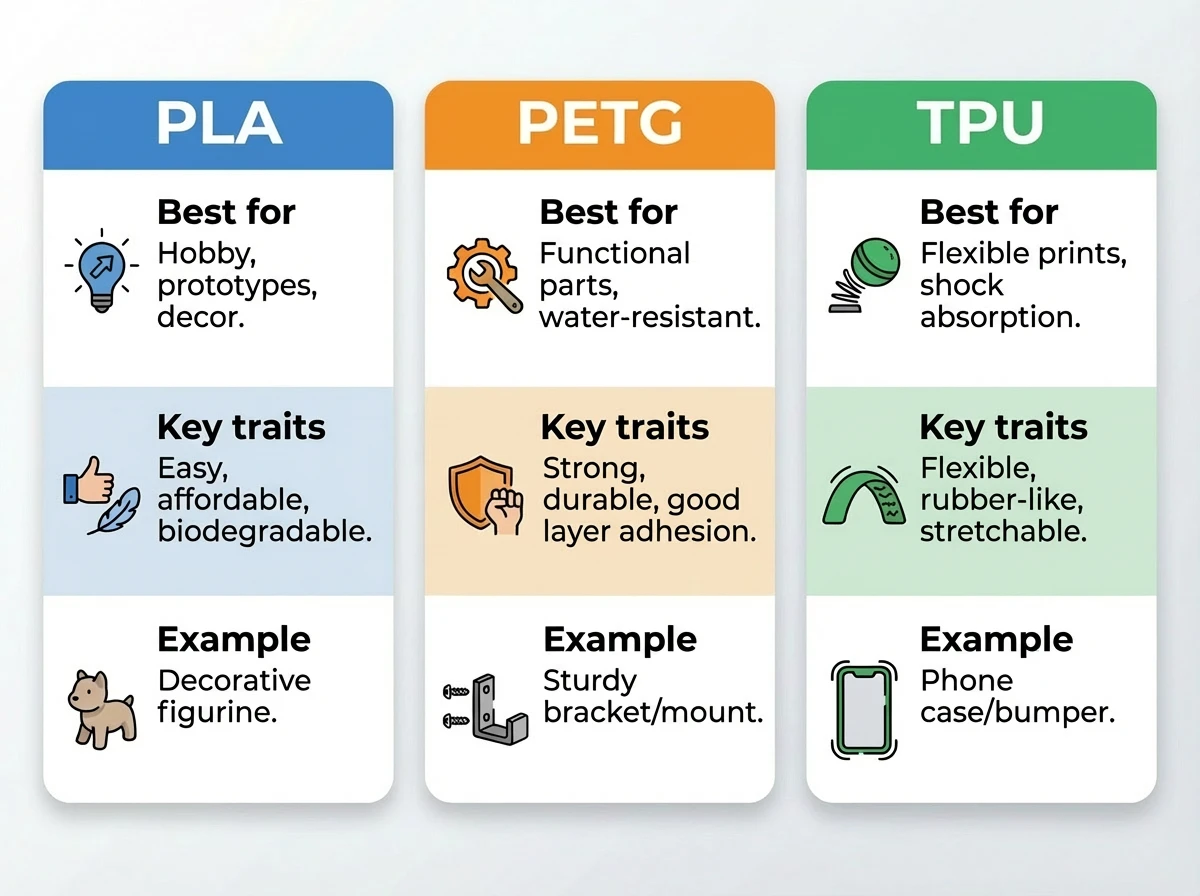 For most beginners, PLA is the best filament. It is forgiving and suitable for many prints. If you want something stronger and more resistant to moisture, PETG is a good second step. TPU only makes sense if you need flexible material.