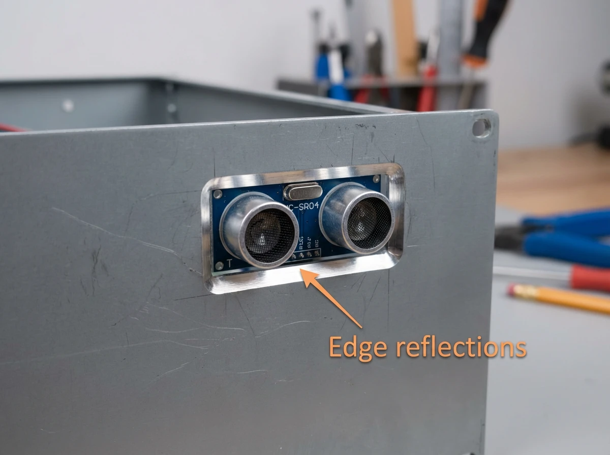 Ultrasound becomes more difficult if your target does not reflect sound well. Soft materials (fabric, foam) absorb sound. An angled surface bounces the echo away. And you can sometimes miss narrow objects because the beam does not receive enough reflection. Mounting also plays a role: if you place the sensor in a tight housing, edges and cutouts can cause extra reflections. This results in measurements that sometimes suddenly overshoot.