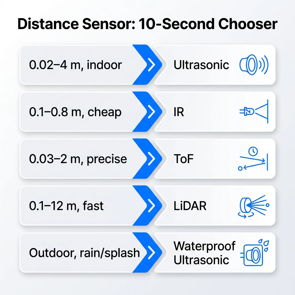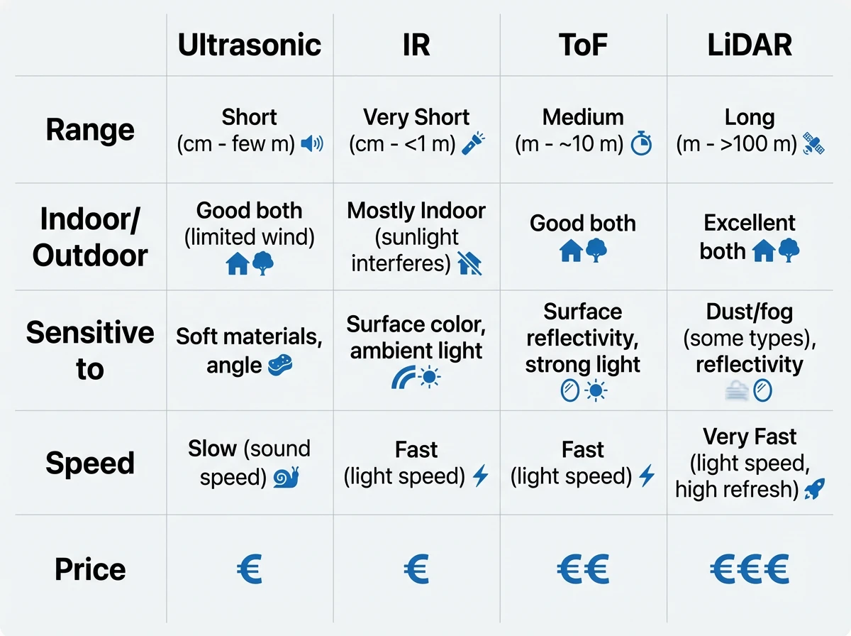 That depends on your goal. For quick prototypes, ultrasound is often the easiest starting point. If you want to measure short distances accurately, ToF is often more convenient. If you mainly work at short distances and want simple detection, IR is often sufficient.