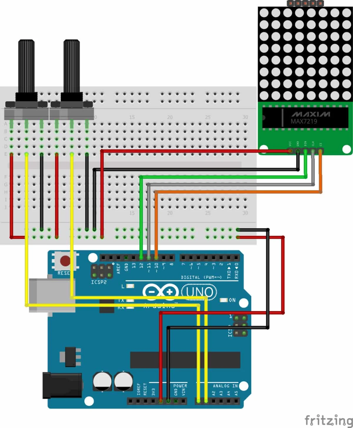 Now that you have all the parts you can start connecting the parts. First you go from the 5V on the UNO to the plus on the breadboard and from the GND to the minus on the breadboard. Once you have done that you put the potentiometers on the breadboard. Then you take the leftmost pin of both potentiometers and connect it to the plus, the rightmost to the minus and the middle of one potentiometer you connect to the A0 and the other to the A1. Now we are going to connect the led matrix, the led matrix you put in the breadboard with the chip at the bottom. The VCC of the led matrix goes to the plus and the GND goes to the minus. Then we connect the I/O pins to the three other pins on the matrix. The DIN goes to pin 12, the CS to pin 10 and the CLK to pin 11.