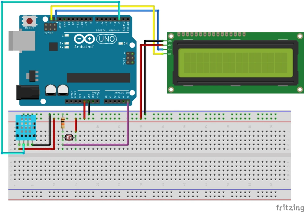 In this Arduino project you will learn how to make a weather station yourself. You do this using a DHT11 temperature & humidity sensor and a LDR. The temperature, humidity and light intensity are displayed on a 16×2 LCD display.